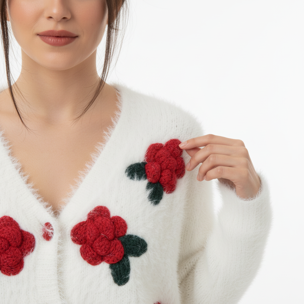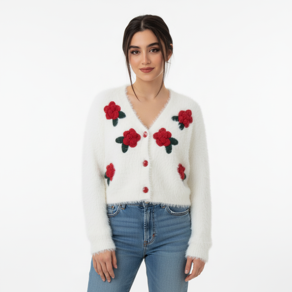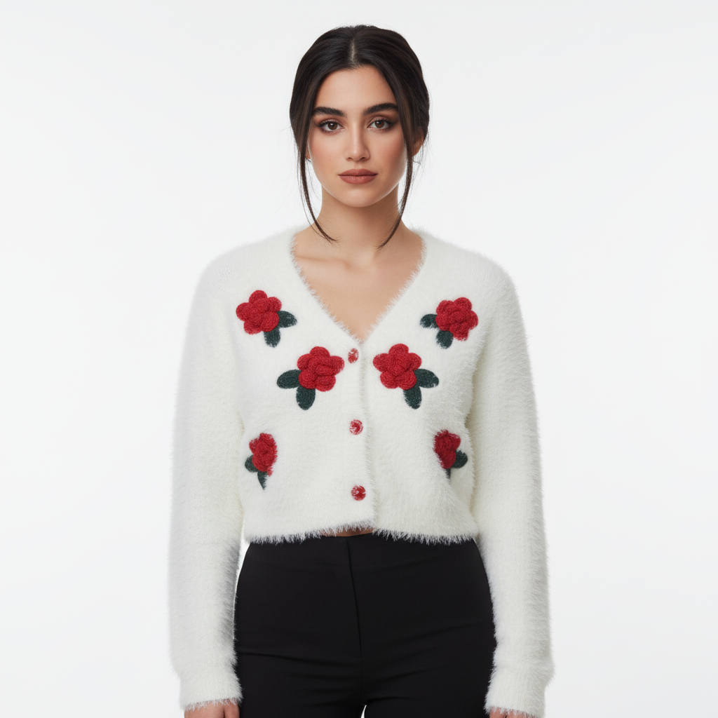 Soft texture. Bold bloom. Cozy statement. The ZAKH Bloomcore Fuzzy Knit Cardigan – Snow & Scarlet Edition is a dreamy fusion of warmth and whimsy. With its plush white base and vibrant red floral appliqués, this piece brings handmade charm into the streetwear spotlight. 🔍 Key Features • Colorway: Snow White base with Scarlet Red flowers and Forest Green leaves • Material: Ultra-soft faux fur knit for a warm, cloud-like feel • Closure: Five red center buttons for secure fastening and visual contrast • Design Details: o Six hand-crocheted flower appliqués arranged symmetrically o Fluffy texture for a cozy, elevated look • Fit: Relaxed silhouette with drop shoulders and soft drape