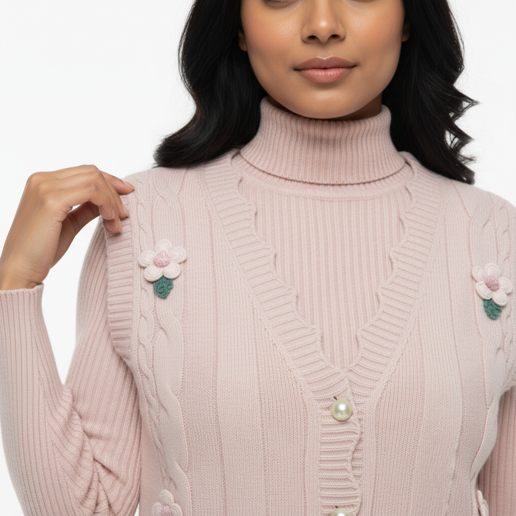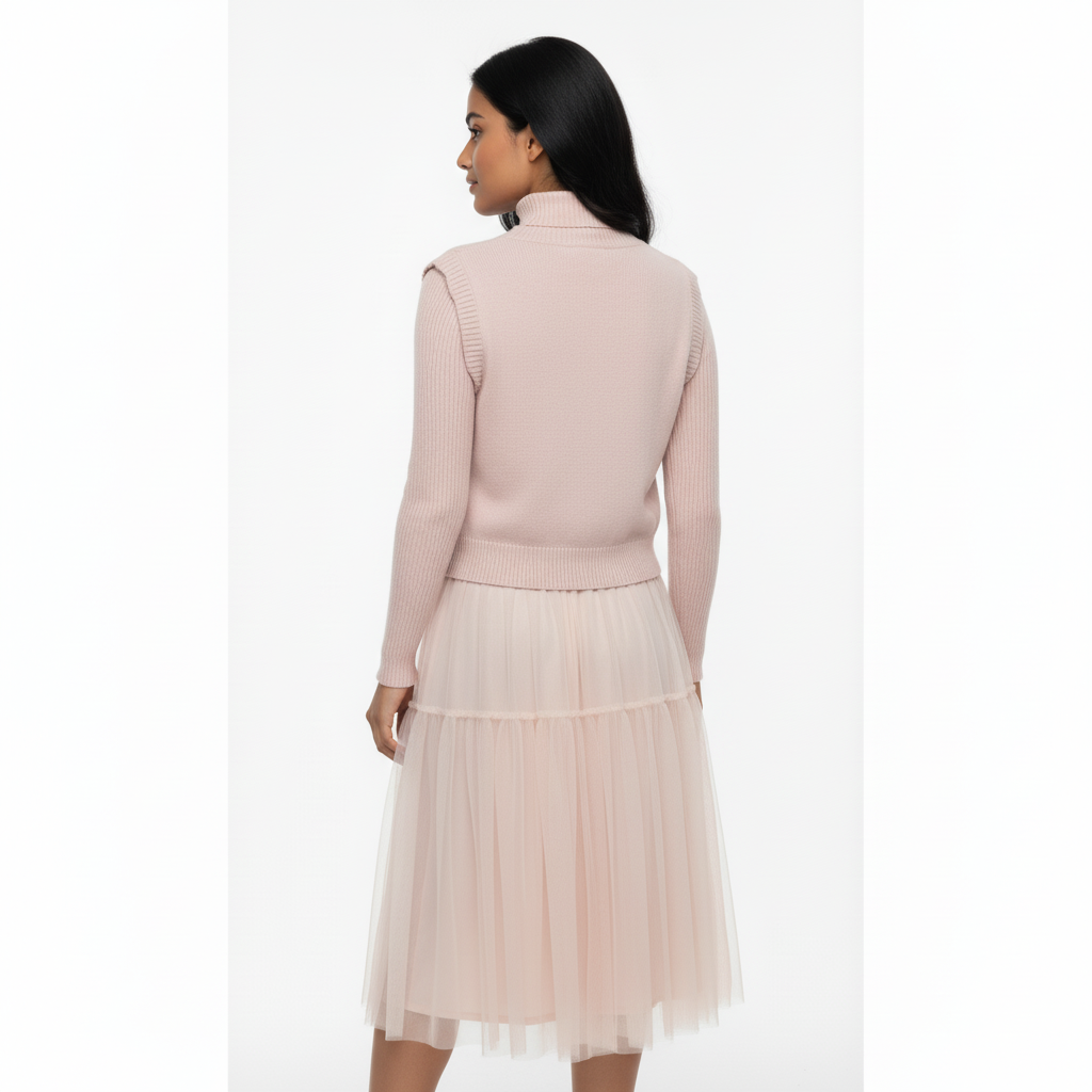 Step into softness with this blush-toned two-piece set that blends cozy knitwear with airy elegance. The ribbed turtleneck top features delicate floral embroidery and pearl-style buttons, while the layered tulle skirt adds graceful movement and a dreamy silhouette. Perfect for boutique styling, semi-formal occasions, or soft editorial looks. ✨ Features: • Coordinated set: embroidered knit top + layered tulle skirt • Ribbed long-sleeve top with pearl button front • Pink floral embroidery with green leaf detailing • Horizontal seam detail on skirt for added structure • Soft blush colour for a romantic, feminine vibe 📏 Fit & Fabric: • Slim-fit top with stretch • Skirt: layered tulle with elastic waistband • Fabric: Polyester blend (top), nylon tulle (skirt) • Model is 5'6" and wears size S